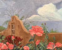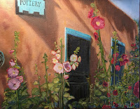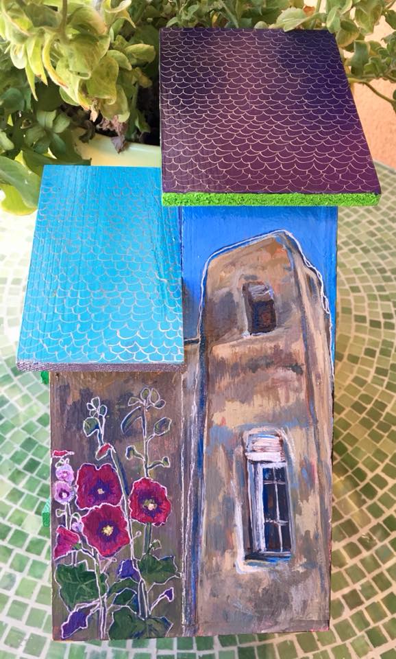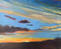 I previously primed four birdhouses I bought at Michael's and started painting the sides. When I first posted photos of my beginning birdhouses another artist I admire asked if I was going to sell them because she wanted to buy one. What a huge compliment! I began painting those and also a larger oil painting, a gift to my cousin, and was feeling a little overwhelmed with all my "Works in Progress" and needed a break. I decided to combine one of my own photos with a photo I was sent by the administrator of "Let's Paint New Mexico" and painted an oil painting on 8"x10" canvas. It is "Sunset Beauty Arroyo Seco" and my submission for Challenge 16 for "Let's Paint New Mexico" shown on the right.